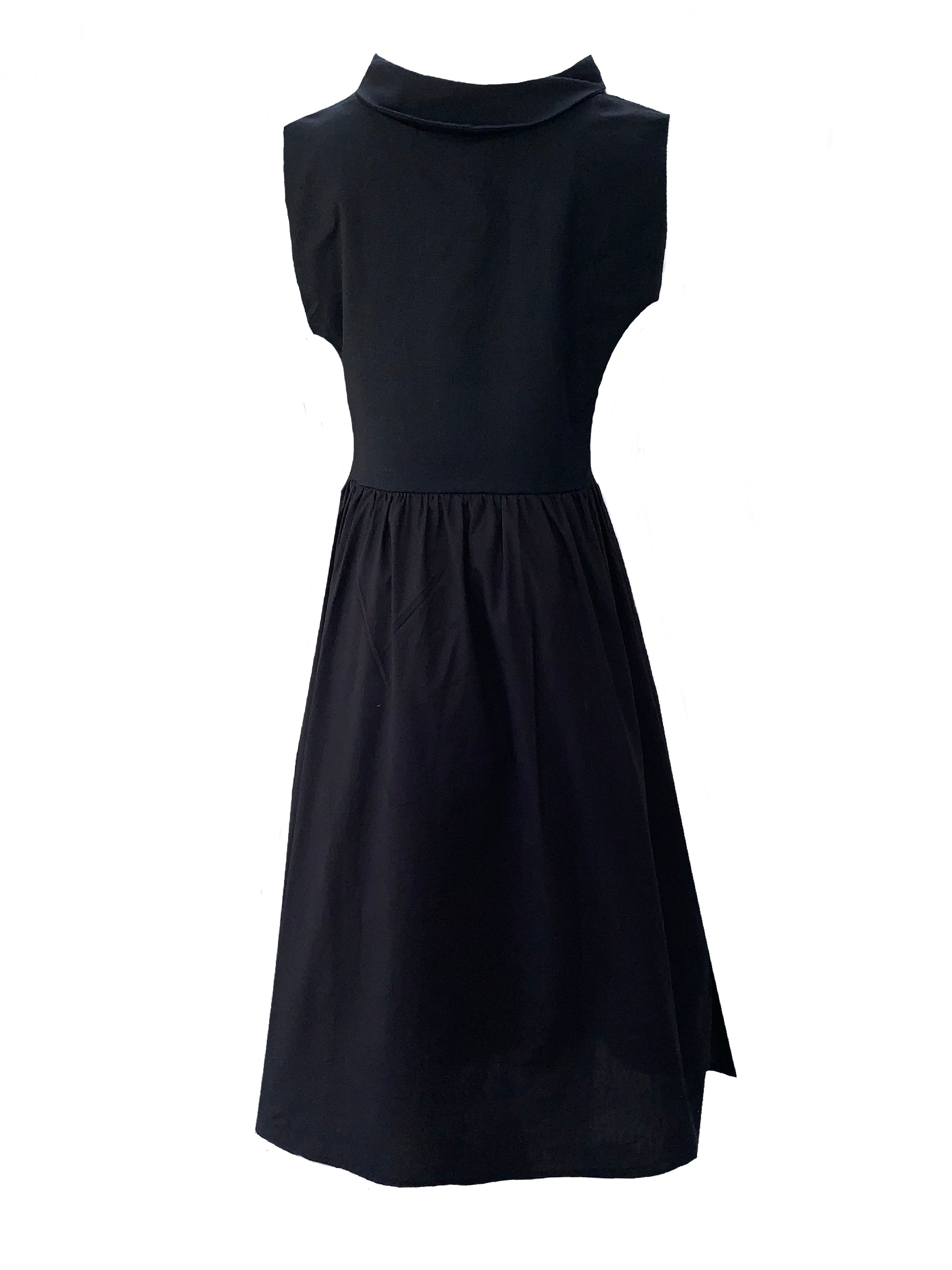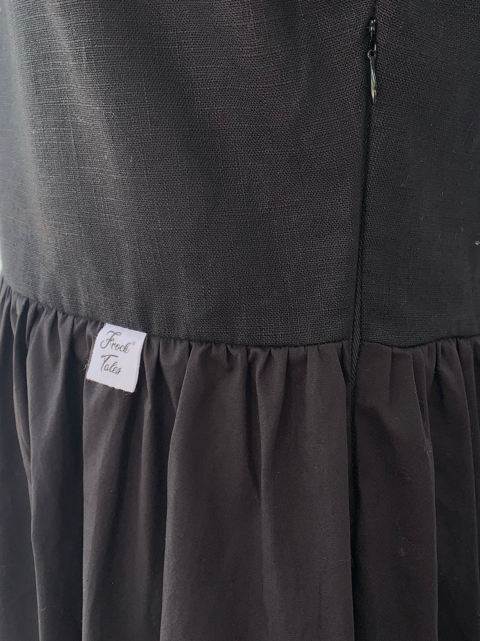 Tale: This is a wonderful use of two fabrics to offer interest and effortless style. The bodice is a woven linen and the skirt cotton poplin, two complimentary textures. The neck is slightly boat shaped with a structured collar that will stay in position for a glamorous silhouette all day long. The bust dart gives shape, with side zip fastening and gathered skirt you will feel comfortable and have ease of dressing. The pocket is a great addition along with the side splits.