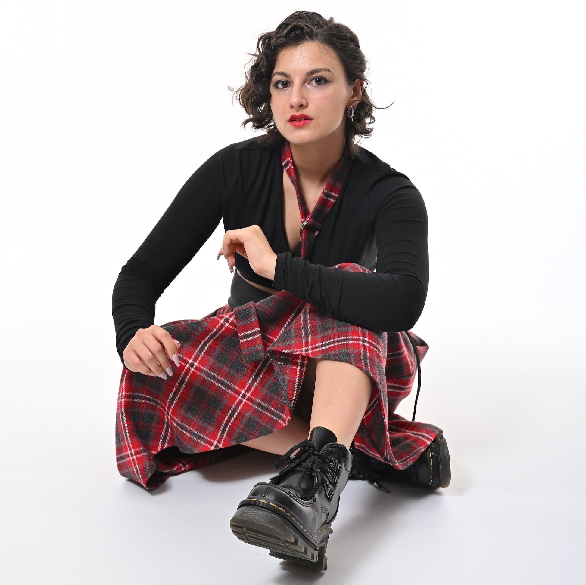 95% Polyester 5% Wool skirt, 95% Cotton 5% Elastane rib waistband