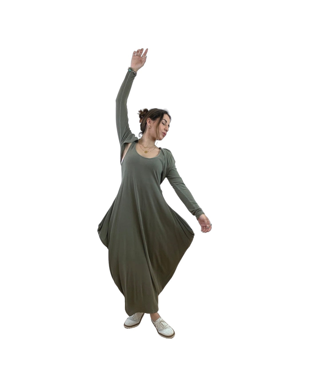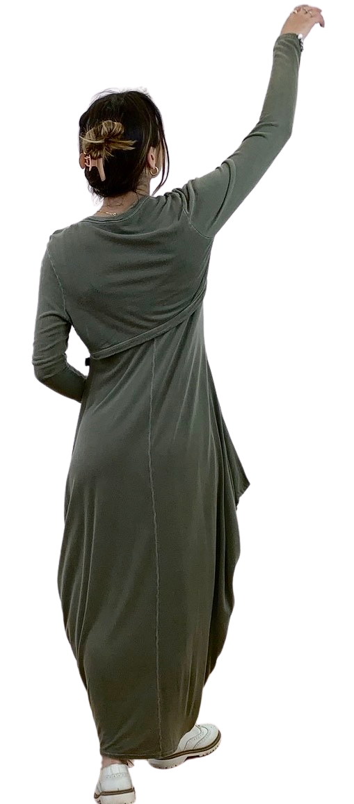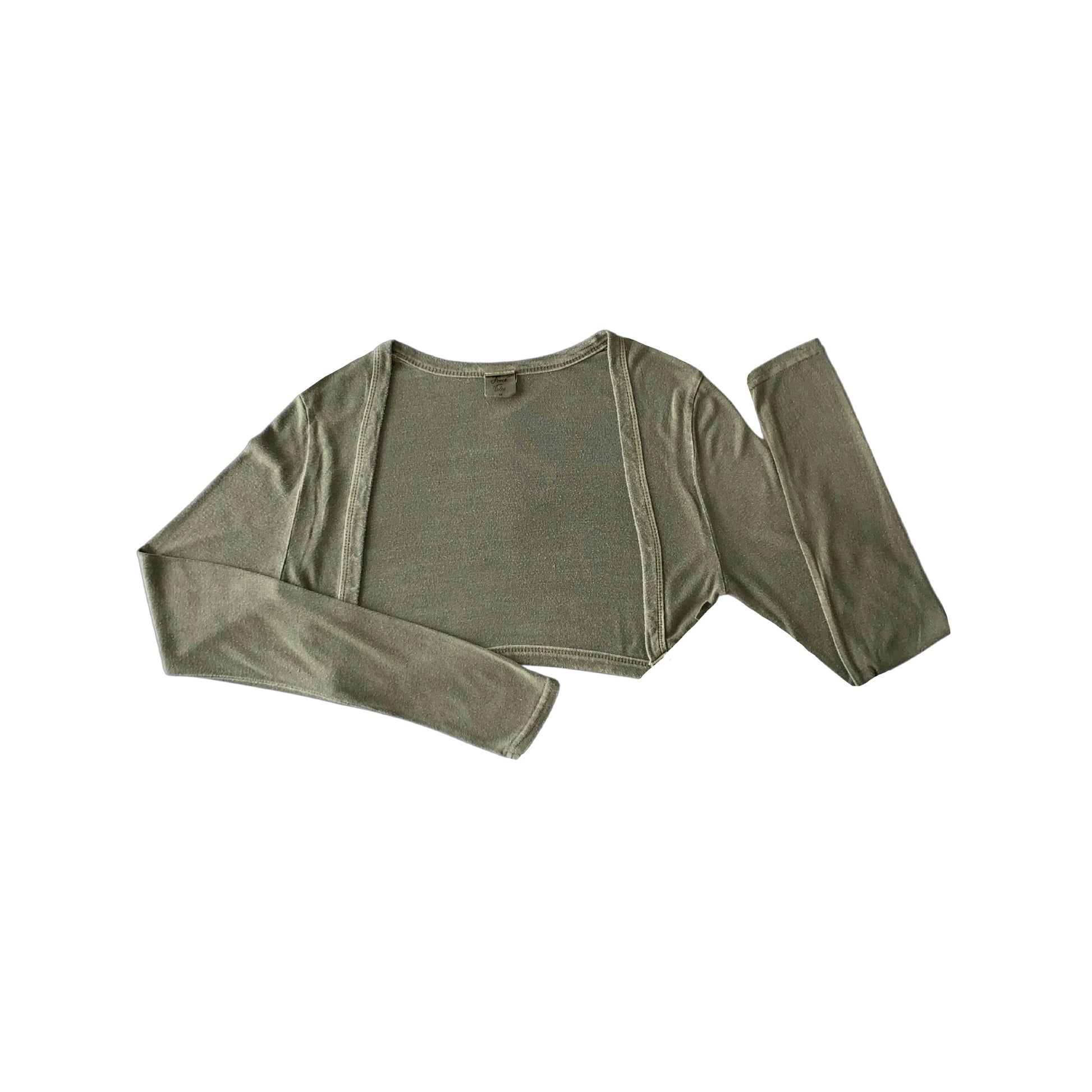 Tale: Once upon a time came a shruglet, too small to be a shrug, so soft and functional offering so many opportunities for layering. Wear it under, wear it over but most of all, with confidence. Fine knit jersey garment dyed for a vintage look and super soft! Our model is 5ft 4" and wears a small with the matching Damsel dress in khaki.