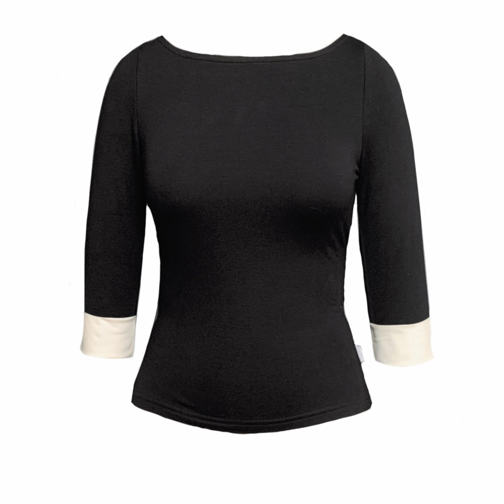 Be your chicest self in our new Darling Top in black, the perfect 'Jeans and a nice top' Top. This top has a classic shape with 3/4 length sleeves and wide round neck. This top is made from viscose lycra and feels super soft against the skin. The all important feature of this staple top is the contrasting cuffs, perfect for a night out or even a day in the office, the darling top is so versatile! Also available in cream with black. Our model is 5ft 4" and wears a size small with our Beau Skirt. Please see our size guide.