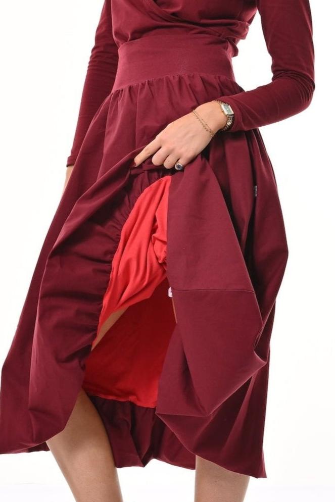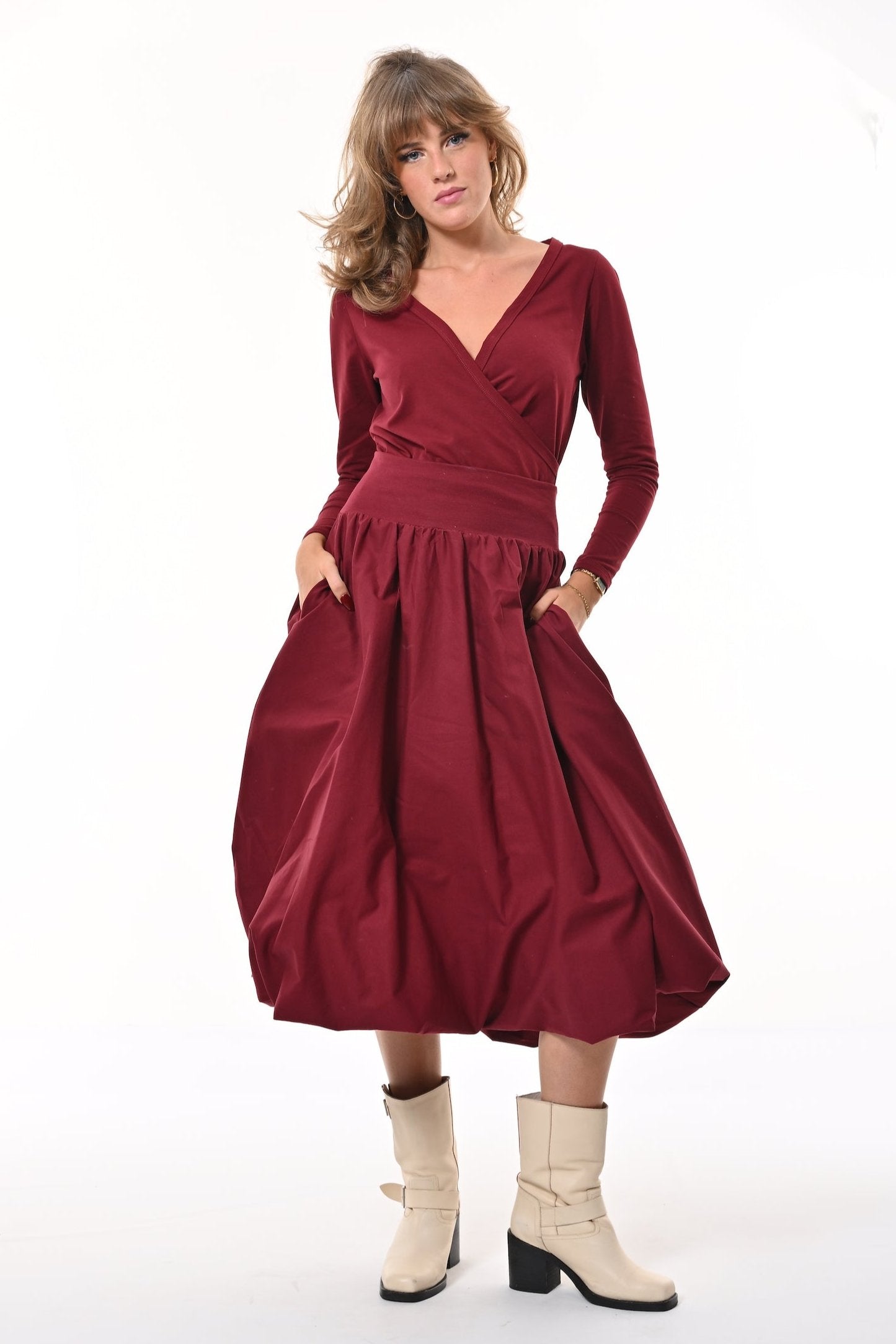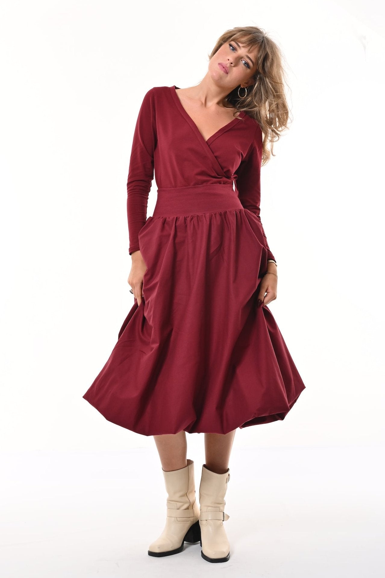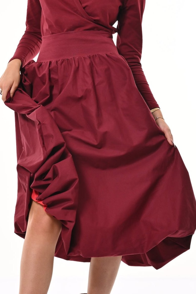 Pull on our Enoki Puffball Skirt for a day to evening adventure. The side pockets are a must in our busy lives and these fit your phone as well as all of your other essentials. The gorgeous deep waistband cinches in your waist without being tight and this skirt is fully lined with soft jersey for ultimate comfort. Our model is 5ft 9" and wears an S with our Juthamat Top in burgundy. Please see our size guide.