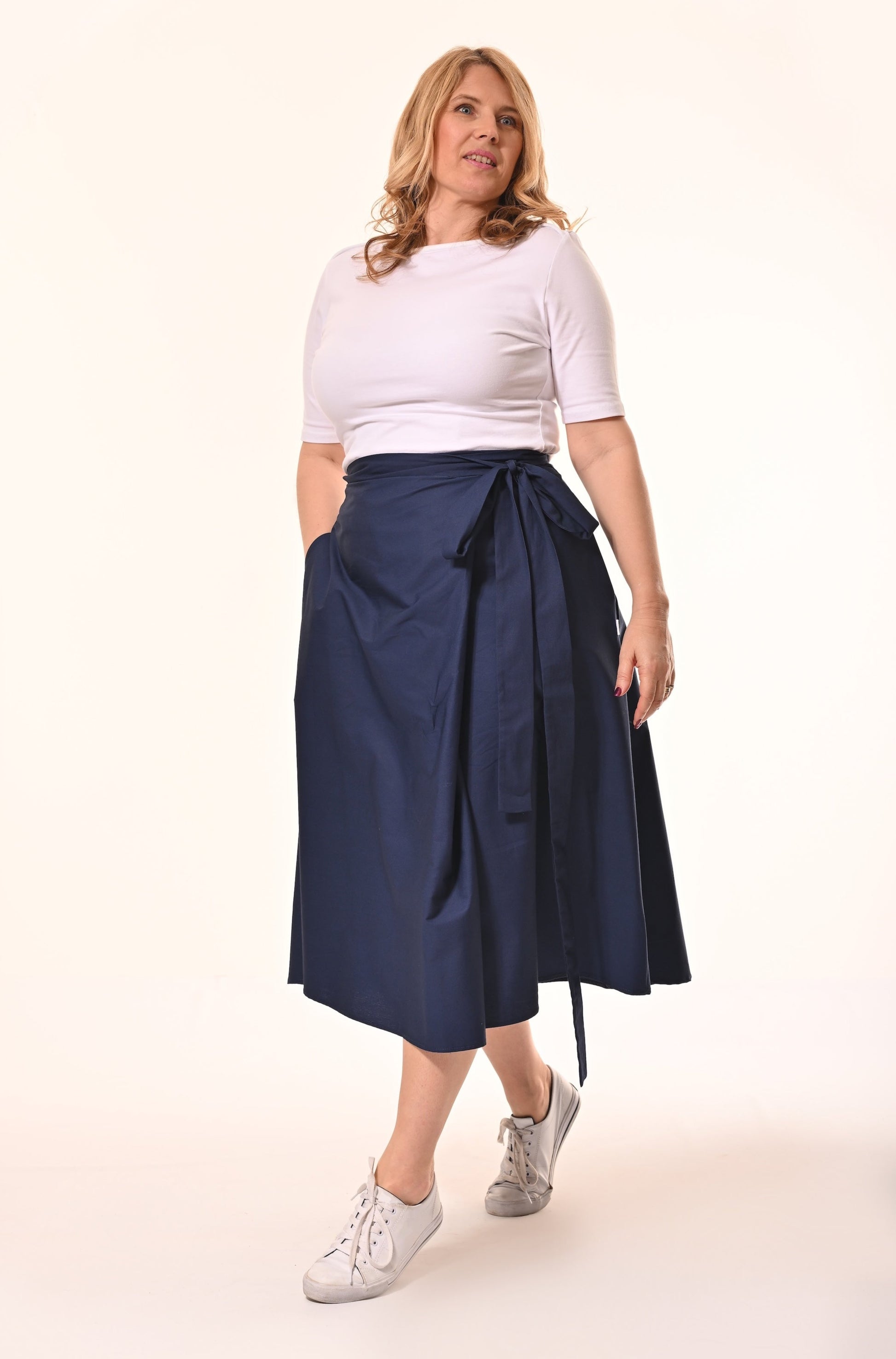 The Illusion Wrap Midi Skirt is a wonderful functional wrap with adjustable ties perfect for warm days and summer sun or worn with boots and cozy jumpers for the colder months. The tie is long enough to tie in a bow or as a knot. This does not include a slit like most wrap skirts, perfect for those who prefer coverage and a more modest look, however, if a slit is your thing, check out our Meyer Wrap skirts. This wrap is a must have wardrobe essential. Our model is 5ft 6" and wears an M. Please see our size guide.