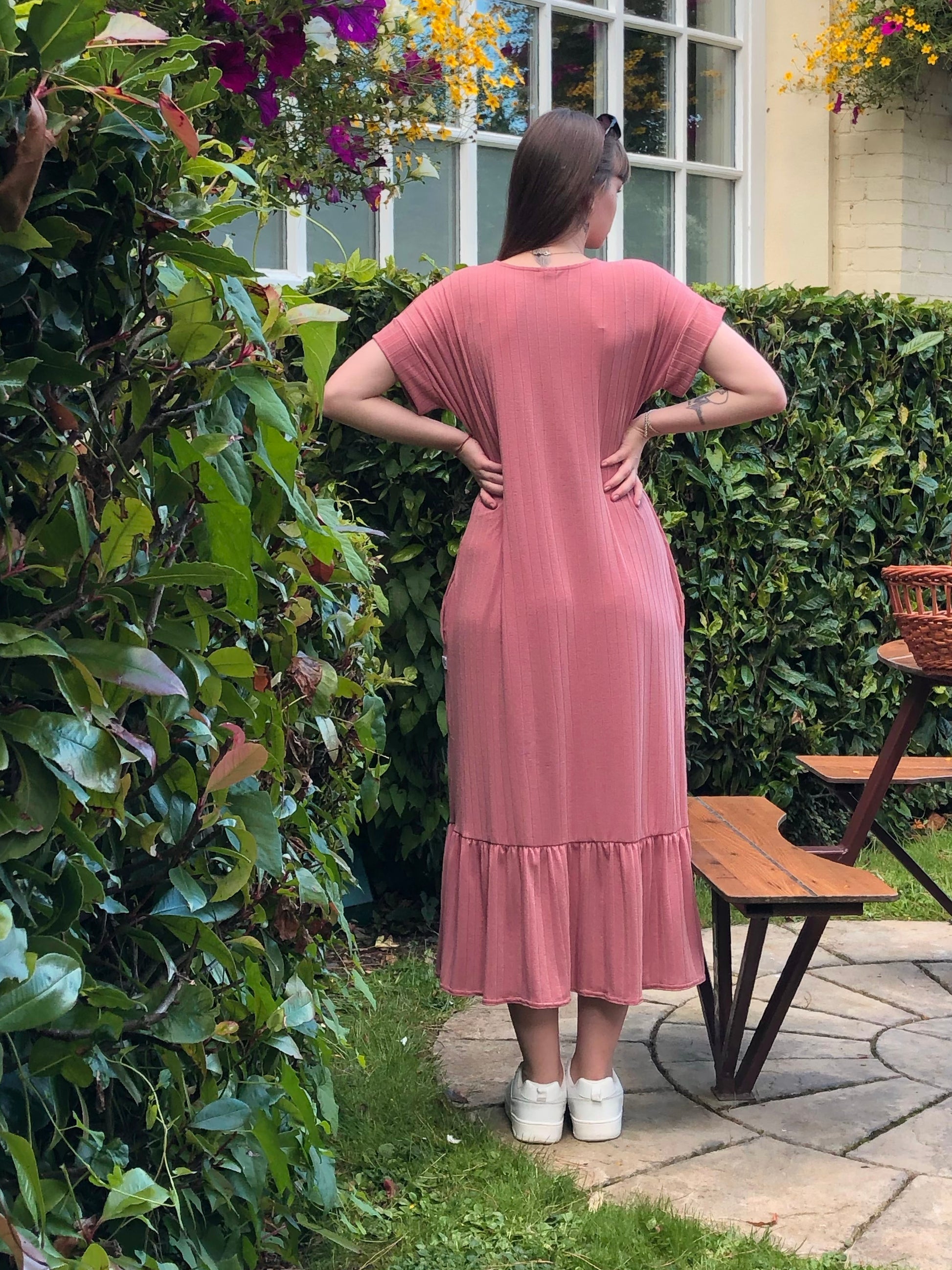 Tale: With a neat knot, A-line shape and hem frill this is an effortless style. Side pockets are a great addition for everyday essentials. The over the shoulder style is flattering and gives a great shape. Also available in black velvet. The centre back length is 125cm. Our model is 5ft 10” and wears a small.