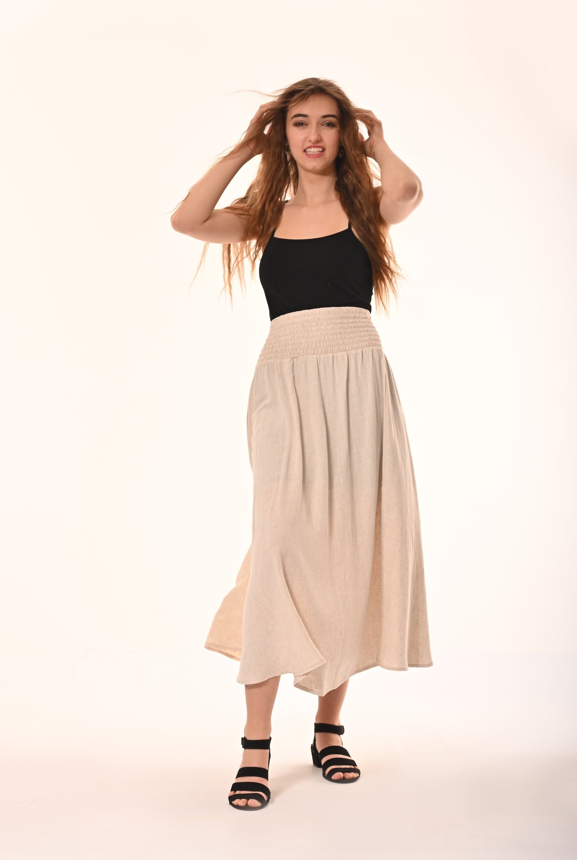 Pull-on our Sicily Midi Skirt for a day of adventure. The side pockets are a must in our busy lives and these can truly fit your phone as well as other essentials. The Gorgeous ruched deep waistband cinches in your waist and this is lined with bamboo jersey for ultimate comfort. The split up the leg is a good length, it shows your leg but isn't scandalous! Our model is 5ft 10" and wears an S.