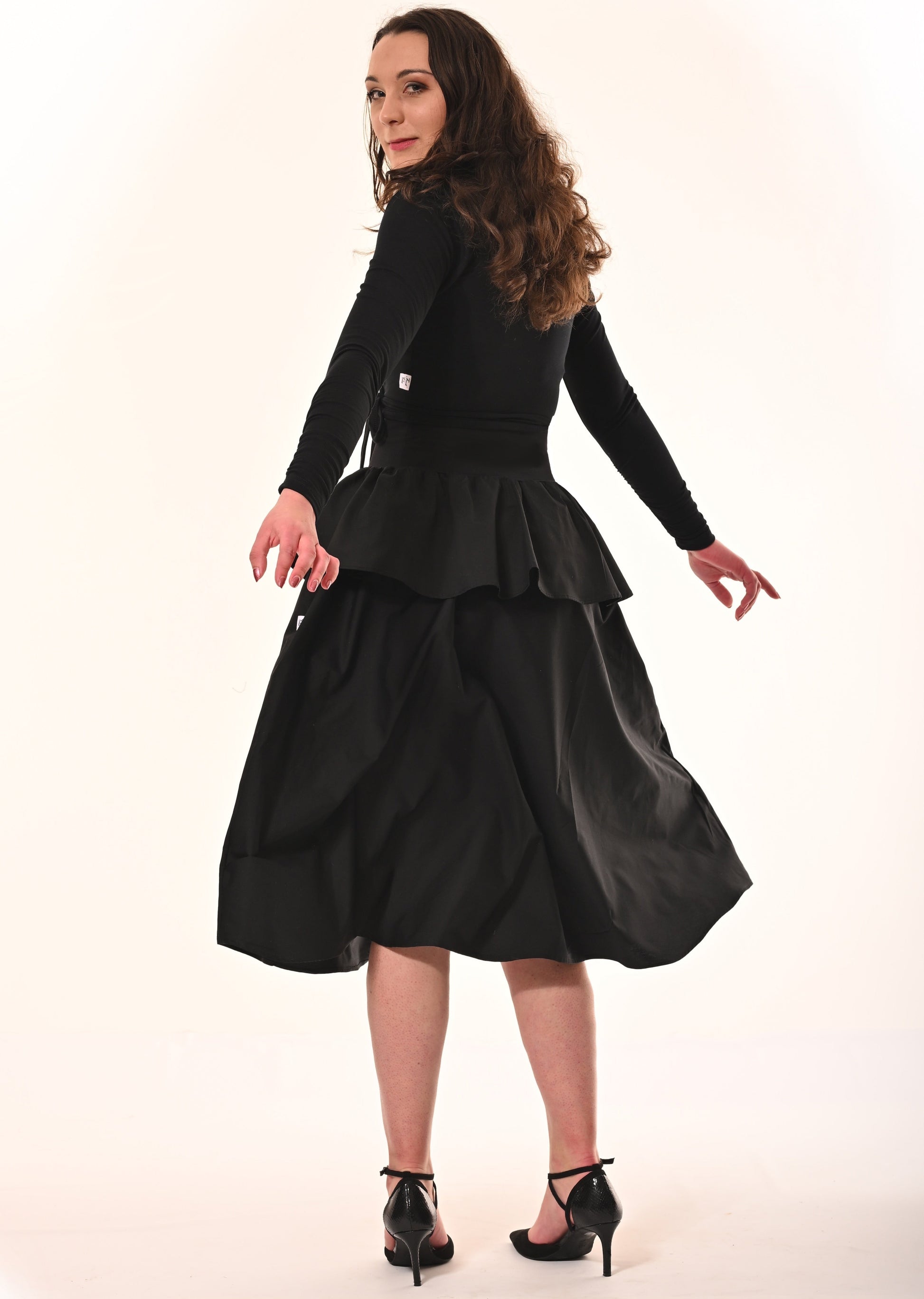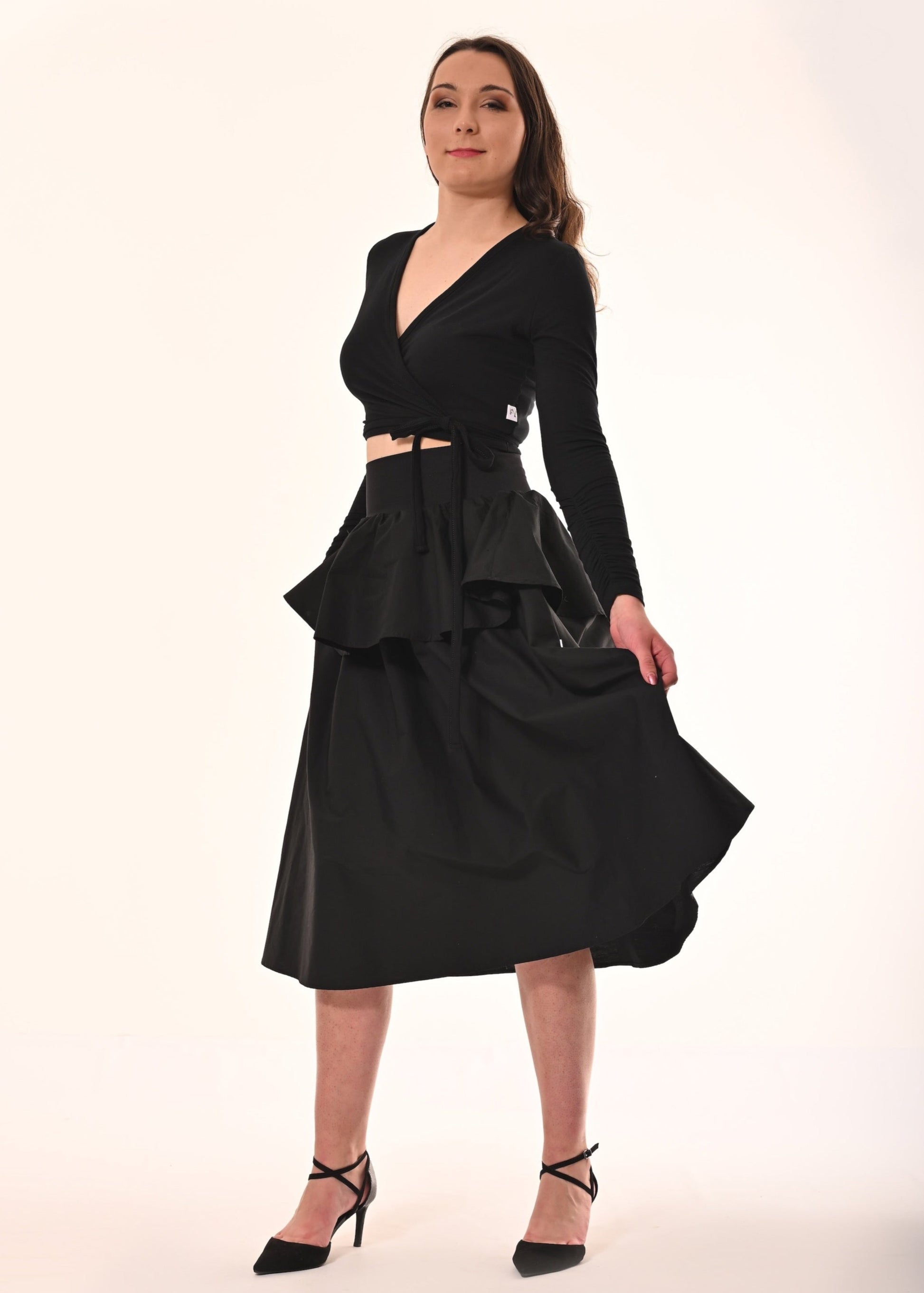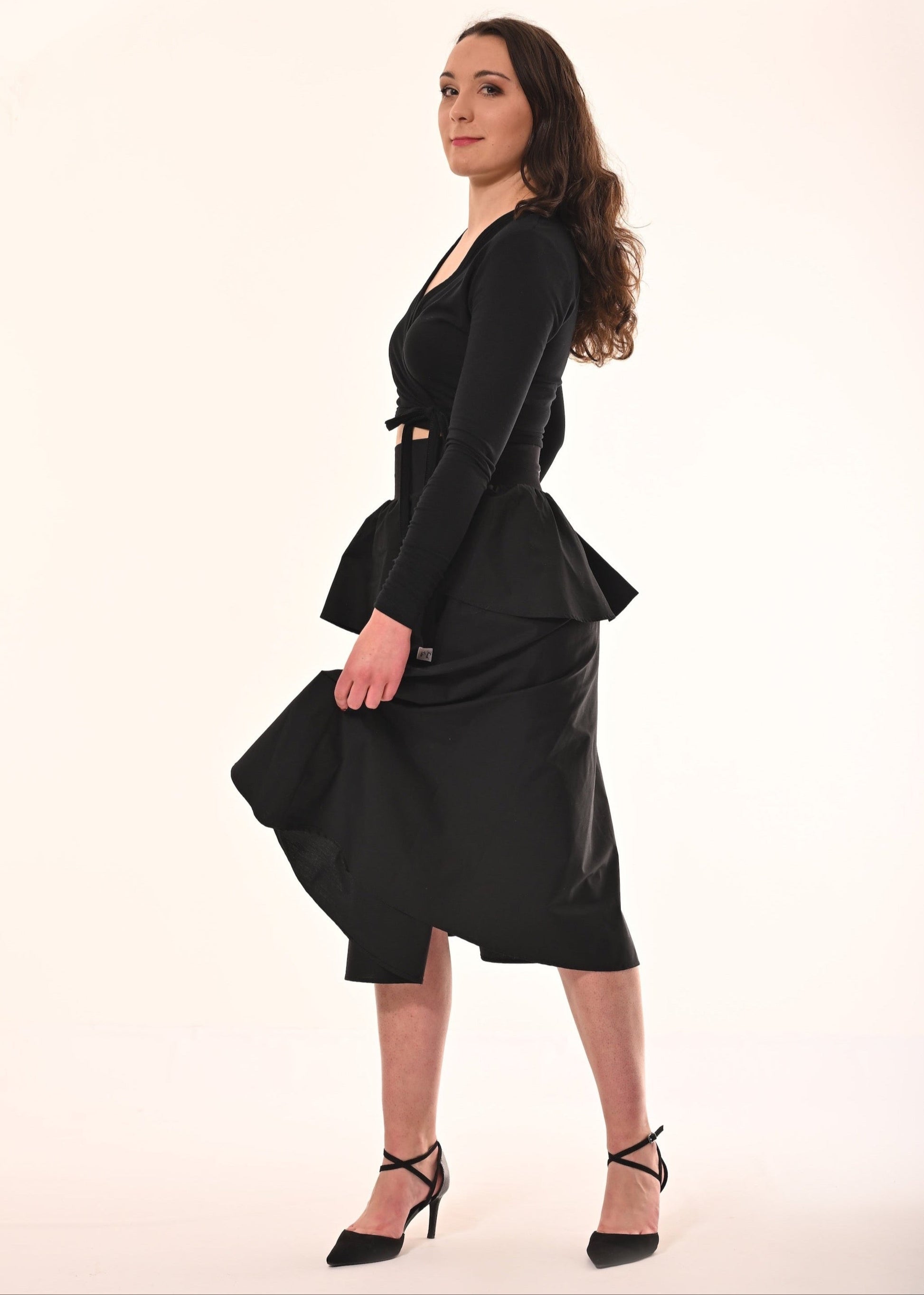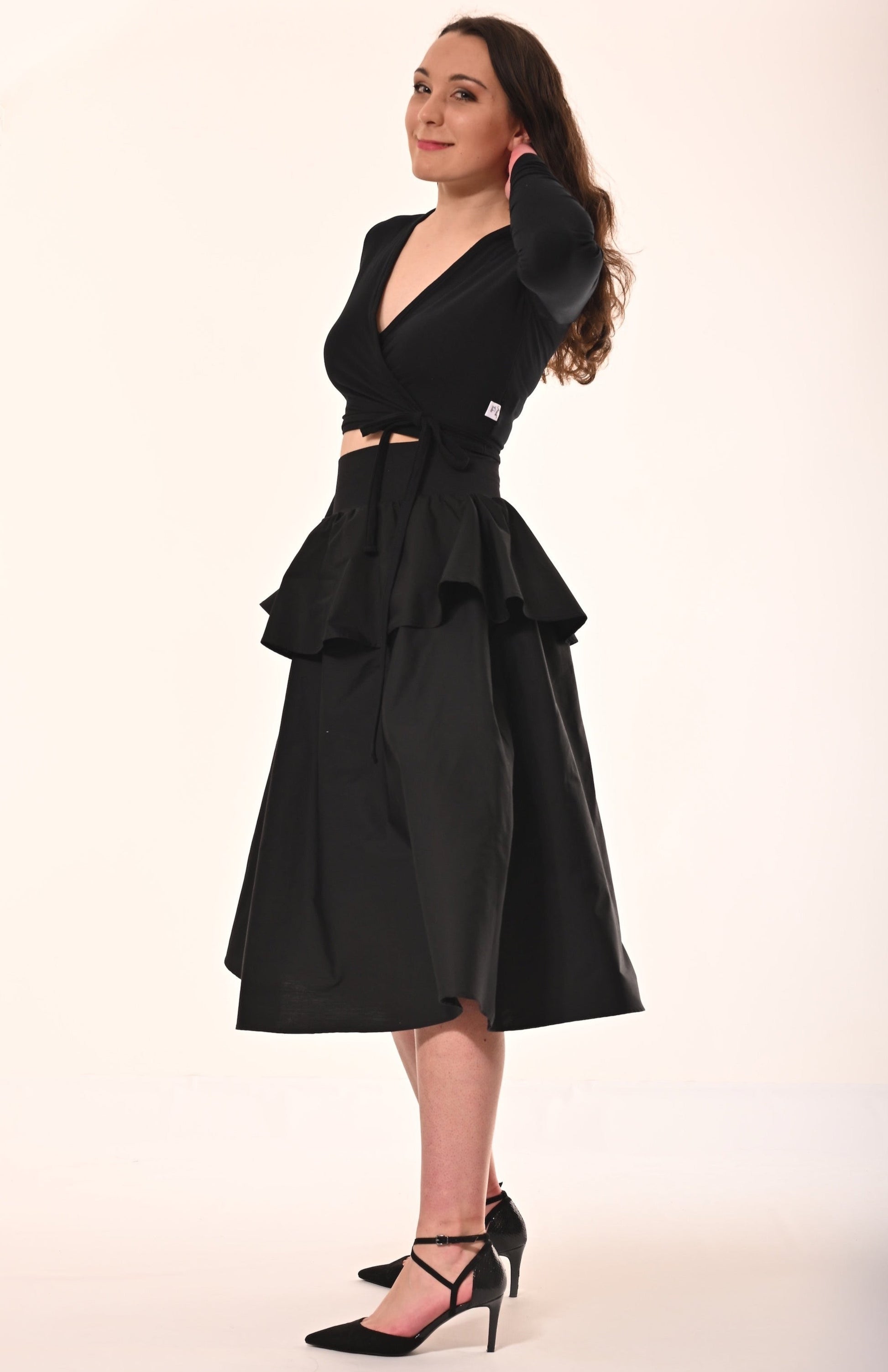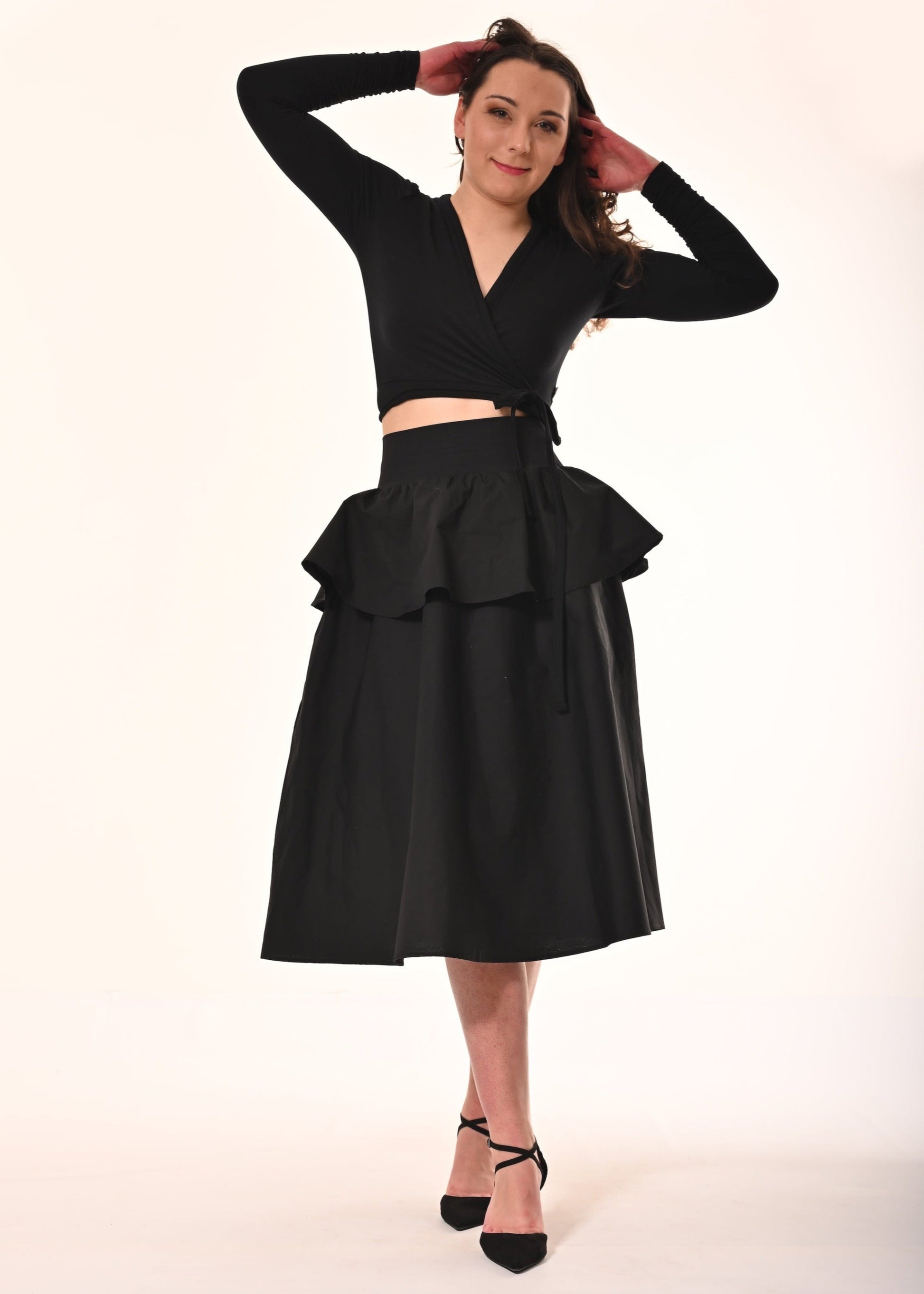 Dance through trees and skip through life in this free style woven skirt. The peplum on the waist paired with the stretchy rib waistband gives the illusion of a small waist and curvaceous hips. This is a great pull-on skirt that is easy to style and has large side seam pockets under the peplum. Our model is 5ft 9" and wears an S with our Daisy Ballet Wrap. Please see our size guide.
