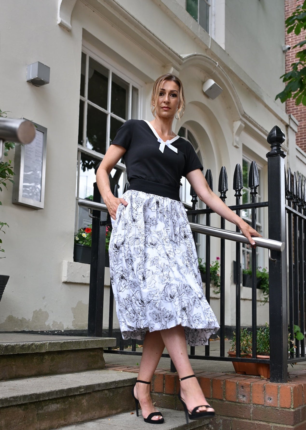 With an elegant deep V neck, edged in white and a centre front satin bow this is so much more than a Tee. Team with our Enoki Skirt for an occasion look. Our model is 5ft 7" and wears an S with our Enoki Skirt. Please see our size guide.